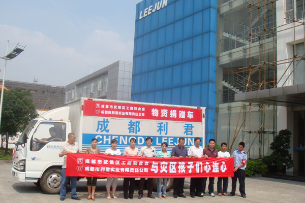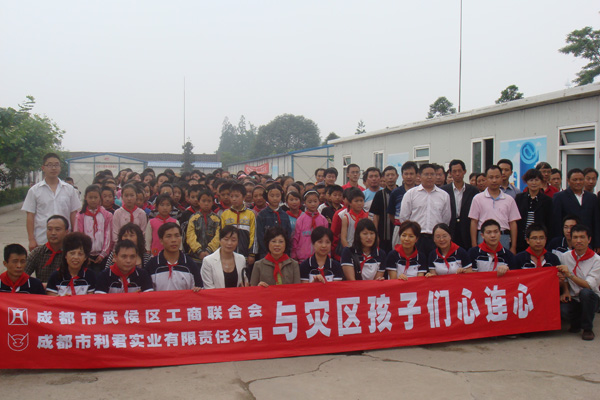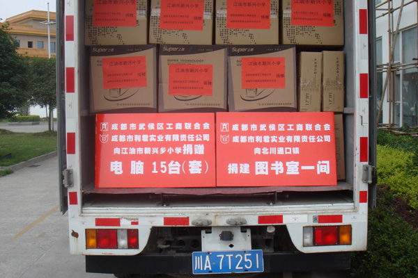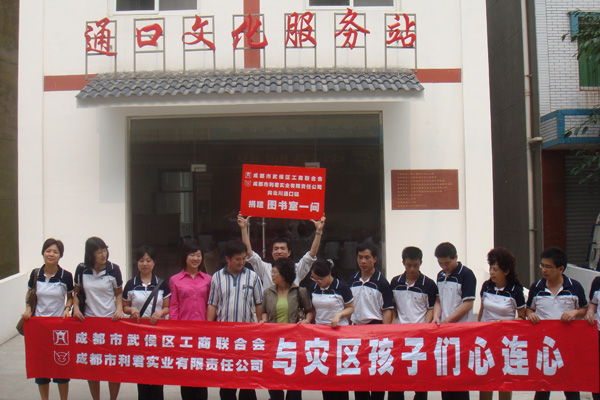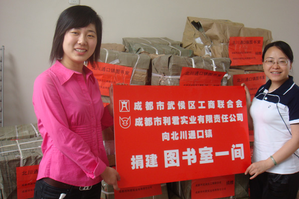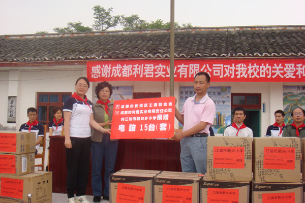 “送一份礼物,寄一份关爱”,在纪念“5.12”汶川大地震一周年之际,成都市利君实业有限责任公司向地震重灾区北川县通口镇捐建图书室一间,捐助图书5100册,桌椅、电脑等物资。向江油市新兴乡小学,捐赠电脑15台(套)。